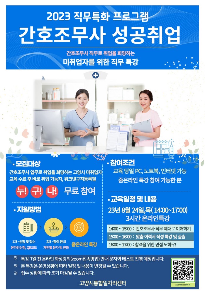 프로그램은 △간호조무사 직무 제대로 이해하기 △맞춤이력서 작성특강과 실습 △합격을 위한 면접 노하우로 구성된다.