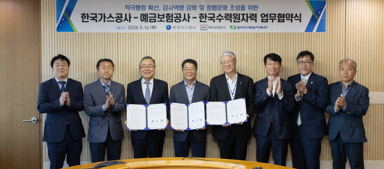 한국가스공사(사장 최연혜)는 5월 16일 서울 중구 스마트워크센터에서 한국수력원자력(사장 황주호), 예금보험공사(사장 유재훈)와 ‘적극행정 확산, 감사 역량 강화 및 청렴문화 조성을 위한 업무협약’을 체결했다고 17일 밝혔다.