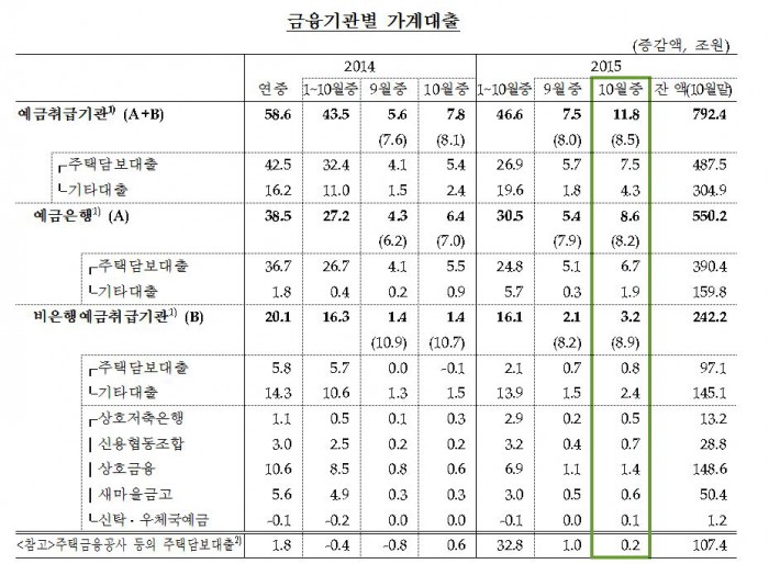 8일 한국은행이 발표한 '2015년 10월중 예금취급기관 가계대출'에 따르면 10월말 현재 은행과 비은행 예금취급기관(저축은행·신용협동조합·새마을금고·상호금융 등)의 가계대출 잔액은 792조4000억원으로 전월대비 11조8000억원 늘었다.