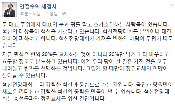 안 전 대표는 이날 자신의 SNS 계정을 통해 "문 대표 주위에서 대표의 눈과 귀를 막고 호가호위하는 사람들이 있다"며 문 대표 주변에서 혁신전대 제안을 거부하는 이유가 "혁신전당대회가 가져올 변화의 바람이 두렵기 때문"이라고 주장했다.
