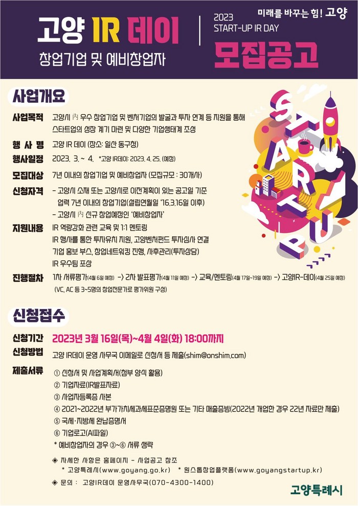 [부자동네타임즈 김인수기자] 우수한 창업·벤처기업을 발굴하고 창업가와 투자자와의 만남의 장을 마련하는 ‘2023 상반기 고양 IR-데이’에 참여할 창업 기업을 모집한다.