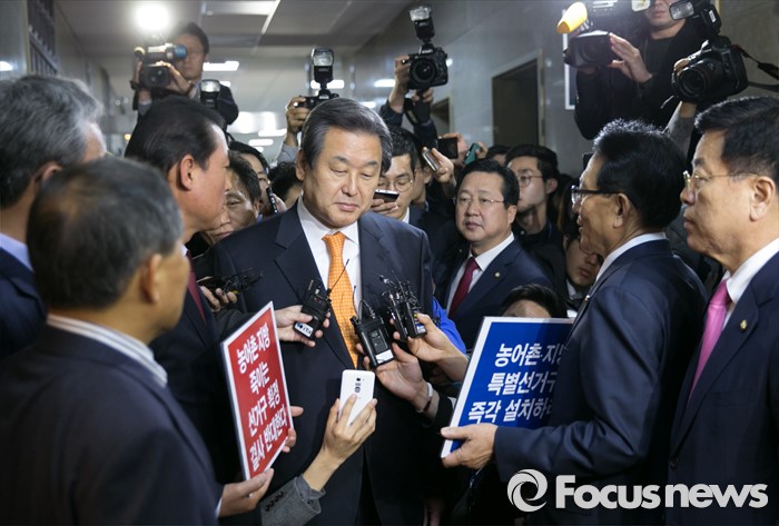 | △ 김무성 새누리당 대표가 11일 오후 서울 여의도 국회 귀빈식당에서 진행되는 여야 지도부 선거구 획정 등 논의를 위한 회동에 참석하며 선거구 축소에 반대하는 농어촌·지방 여야 의원모임 소속 의원들의 의견을 듣고 있다. <사진제공=포커스뉴스> |