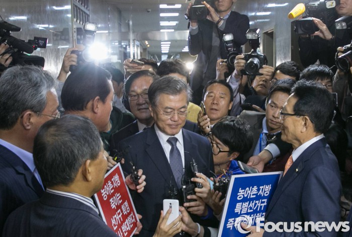 | △ 문재인 새정치민주연합 대표가 11일 오후 서울 여의도 국회 귀빈식당에서 진행되는 여야 지도부 선거구 획정 등 논의를 위한 회동에 참석하며 선거구 축소에 반대하는 농어촌·지방 여야 의원모임 소속 의원들의 의견을 듣고 있다. <사진제공=포커스뉴스> |