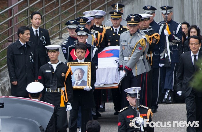 (서울=포커스뉴스) 김영삼 前 대통령이 26일 오후 서울 종로구 서울대병원 장례식장에서 운구차량으로 옮겨지고 있다.