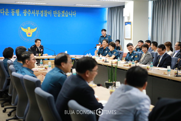 22일 광주서부경찰서에 따르면 배용주 광주지방경찰청장은 서부 서장을 비롯해 각 과장 등 60여명이 참석한 가운데 현장 경찰관들의 활력과 공감대 형성을 위한 생생한 목소리를 청취하는 간담회를 가졌다.