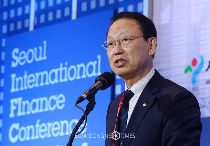 최흥식 금융감독원 원장이 21일 오전 서울 여의도 콘래드호텔에서 열린 '2017 서울국제금융콘퍼런스'에서 축사를 하고 있다. 2017.09.21.
