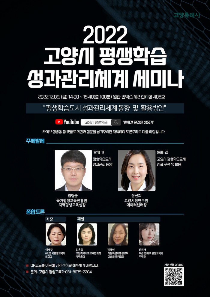 이날 주제발제로 임형균 국가평생교육진흥원 지역평생교육실장이 ‘평생학습도시 성과관리 동향’에 대해, 그리고 고양시정연구원 윤신희 데이터센터장이 ‘고양시 평생학습도시 지표 구축 및 활용’을 발표한다.