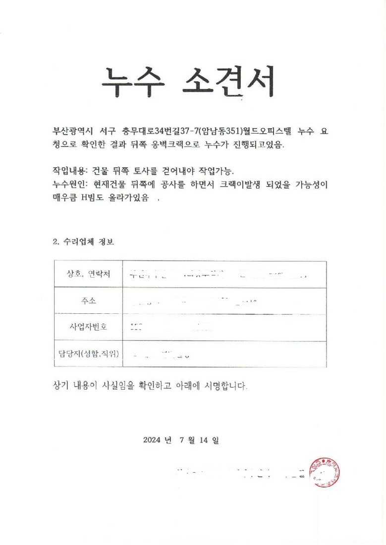 월드오피스텔이 옆 건물 신축 공사로 지하에는 물이 새어 들어오는 등 피해가 발생하고 있다.
