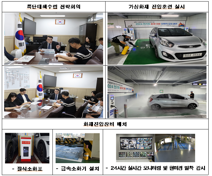 이번 ‘전기차 화재 전략적 대응 특단 체계’는 우선 ‘예방대책’으로 관내 공영주차장 중 전기차 충전소가 설치된 14개 주차장 65개소에 대하여 공영주차장 내 설치된 145개 CCTV를 통합관제센터와 연동하여 전기차 충전시설 24시간 모니터링으로 현미경 밀착 감시체계를 유지하고, 견인보관소(2인 1조)와 연계하여 심야시간대 전수 2회(야간·새벽) 전기차 충전시설 현장 방문 순찰근무를(의무) 시행하고, 진압대책으로 전기차 화재 적응 소화기(금속화재 전용) 15대를 충전시설 전용 주차 구획 가까운 곳에 배치하고 공기 유입 및 유독가스 차단을 위한 질식소화포를 배치하여 유사시 즉응태세를 구축하였으며, 이의 사용을 숙달시키기 위한 전기차 화재 대응 모의훈련을 지난 8월 14일 오후 3시 길음환승 주차장에서 실시하였다.