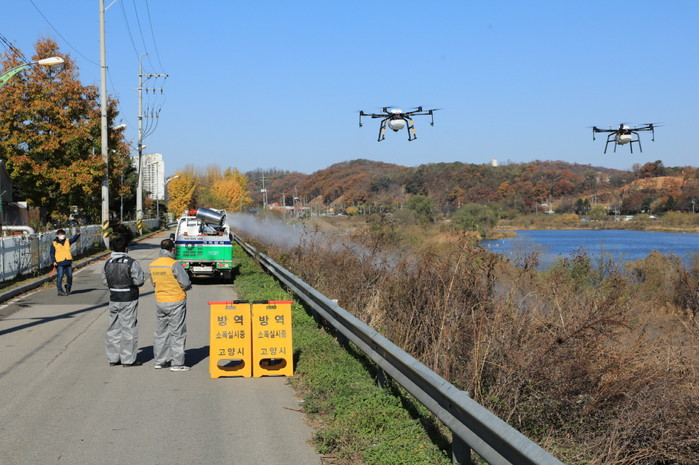 특히 이번 방역에는 고양시 자체보유 드론 뿐 아니라 청년드론봉사단(단장 이준석), 원당농협(조합장 강효희), 송포농협(조합장 임용식)에서 소독살포용 드론을 지원하여 기존에 하천폭이 넓어 방제가 어려웠던 하천변에 다중동시방제를 실시했다.