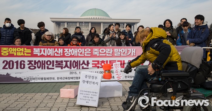 (서울=포커스뉴스) 9일 오전 서울 국회 앞에서 열린 '2016 장애인복지예산 국회통과 규탄 기자회견'에서 전국장애인차별철폐연대를 비롯한 시민단체 회원들이 퍼포먼스를 하고 있다.