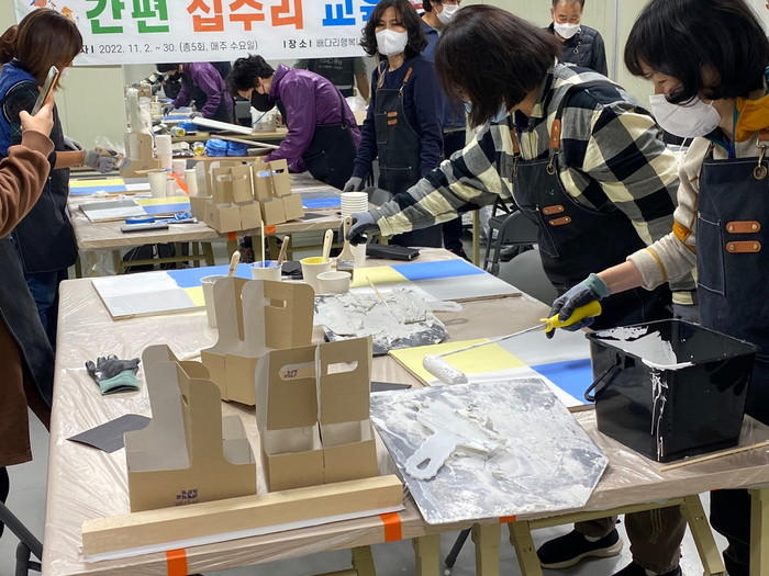 교육은 집수리 이론 교육과 실습과정을 포함해 ▲집수리 기초교육 및 목공키트 제작실습 ▲실리콘 이론 및 실습 ▲전기 이론 및 실습 ▲수전 이론 및 실습 ▲페인트 이론 및 실습 순서로 진행됐다.