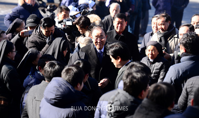 반기문 전 유엔 사무총장이 14일 오전 충북 음성 꽃동네를 방문해 관계자와 인사를 나누고 있다. 2017.01.14.