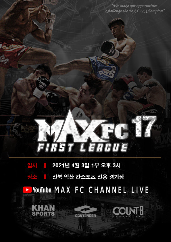 한편, 4월 3일 열리는 MAXFC 퍼스트리그 17은 아마추어 4전 이상 전적의 신인 및 프로선수들을 3월 12일까지 공개 모집한다. 접수는 MAXFC 홈페이지에서 출전 양식을 다운받아 메일로 접수 받는다.