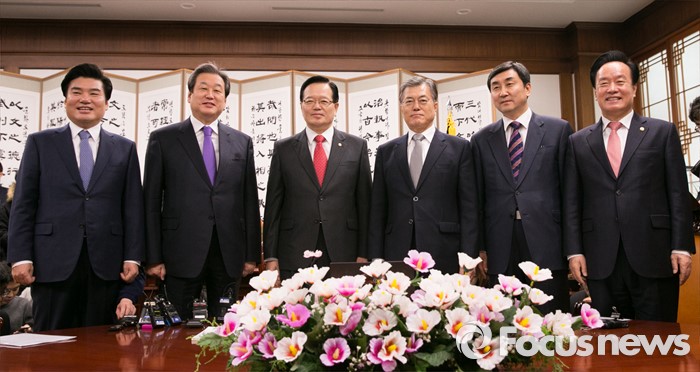 | △ 3일 오전 서울 여의도 국회에서 정의화(왼쪽 세번째) 의장을 비롯한 여야 대표가 선거구 획정 논의를 위해 만나 기념사진을 찍고 있다. 왼쪽부터 새누리당 원유철 원내대표, 김무성 대표, 정의화 국회의장, 새정치민주연합 문재인 대표, 이종걸 원내대표, 이병석 정개특위 위원장. <사진제공=포커스뉴스> |