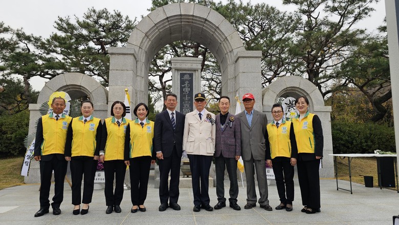 1일 전국 전몰학도의용군 추념식에 참석한 학도의용군 임원과 신천지 자원봉사단 전주지부원 기념사진을 촬영하고 있다.