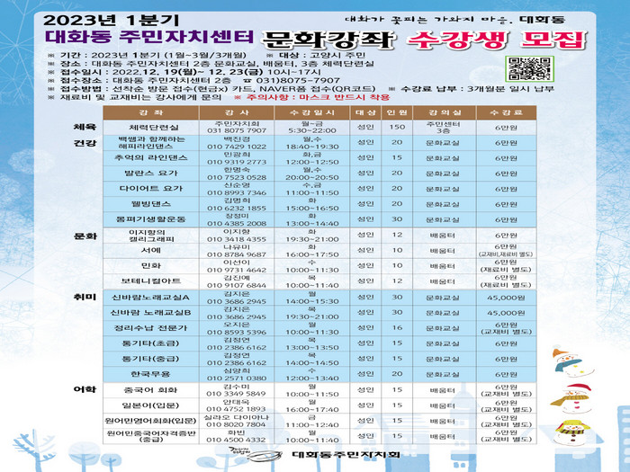 대화동 주민자치센터 2023년 1분기 문화강좌에 대한 궁금한 사항은 대화동 주민자치센터 주민자치실(☏031-8075-7907)로 문의하면 된다.