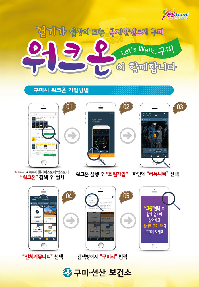가입방법은 Play(플레이)스토어나 App(앱)스토어에서 ‘워크온’을 검색하여 설치한 후 전체 커뮤니티에서 ‘구미시’와 본인이 소속된 읍·면·동 그룹을 선택하면 된다.
