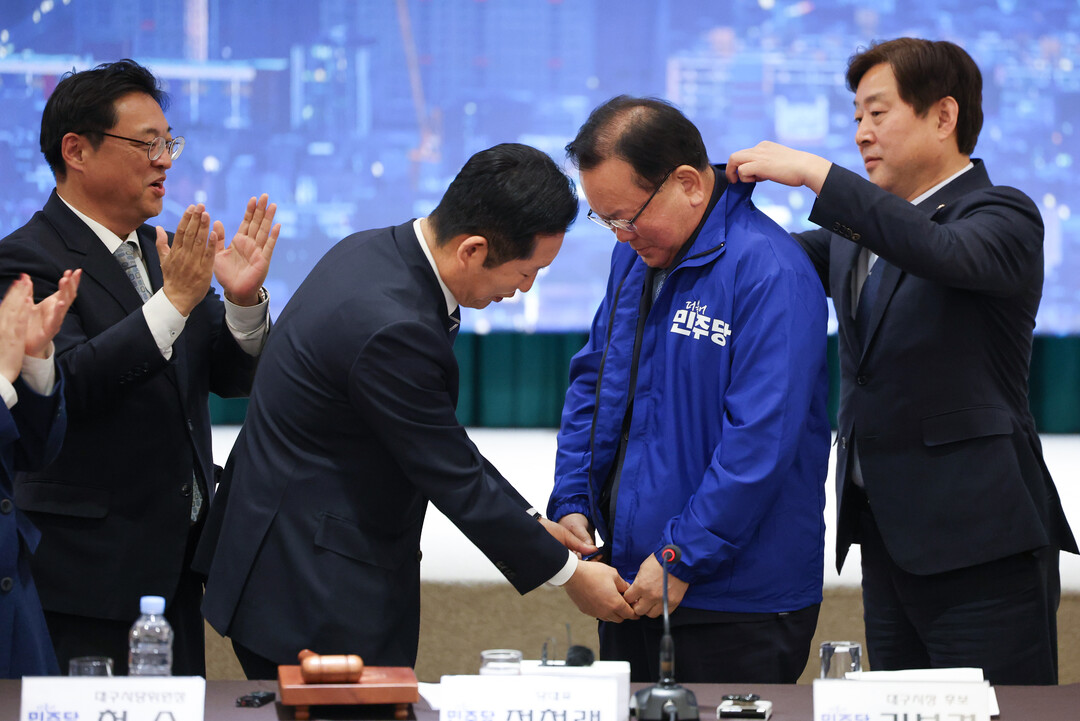 더불어민주당 정청래 대표가 8일 대구 북구 인터불고 엑스코 호텔에서 열린 더불어민주당 현장 최고위원회의에서 대구시장 후보인 김부겸 전 국무총리에게 당 점퍼를 입혀주고 있다. 2026.4.8