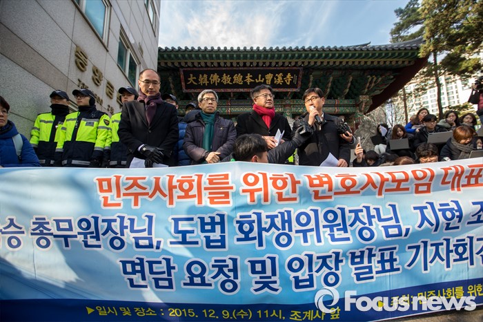 | △ 경찰이 예고한 한상균 민주노총 위원장에 대한 체포영장 집행 최후통첩 시각이 다가오고 있는 9일 오전 서울 종로구 조계사 앞에서 민주사회를 위한 변호사모임 대표단이 지현 조계사 주지스님과 화쟁위원장 도법 스님의 면담을 요청하는 기자회견을 하고 있다. <사진제공=포커스뉴스> |