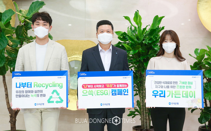 [부자동네타임즈 이현재 기자]우리금융지주의 자회사 우리은행은 ESG경영 강화를 위해 전사적으로 추진 중인‘으쓱(ESG) 캠페인’의 일환으로 본점 전부서에 분리수거함을 도입하는‘나부터 Recycling’캠페인과 매주 금요일 직원식당에 저탄소 식단을 제공하는‘우리 가든 데이’를 실시한다고 1일 밝혔다.