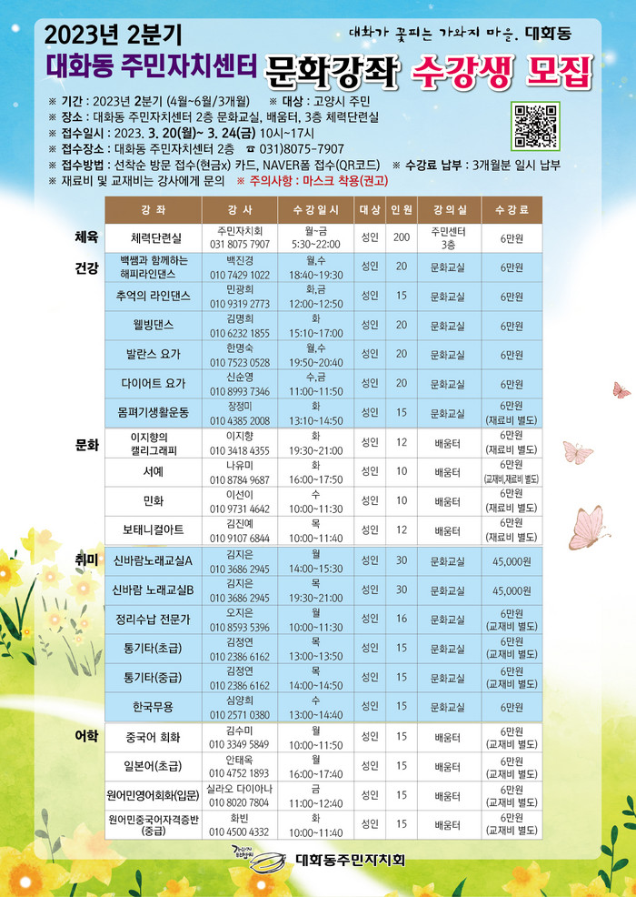[부자동네타임즈 김인수기자] 고양특례시 대화동 주민자치회는 주민들의 문화욕구 충족을 위해 2023년 2분기 문화강좌 수강생을 3월 20일부터 24일까지 모집한다고 밝혔다.