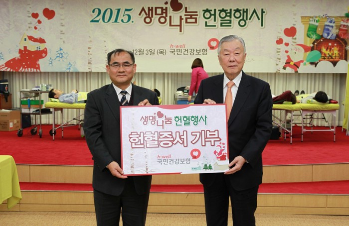| △ 성상철 국민건강보험공단 이사장(우)이 생명나눔 헌혈과 헌혈증 기부 행사에서 헌혈증서를 기부하고 있다. <사진출처=국민건강보험공단> |