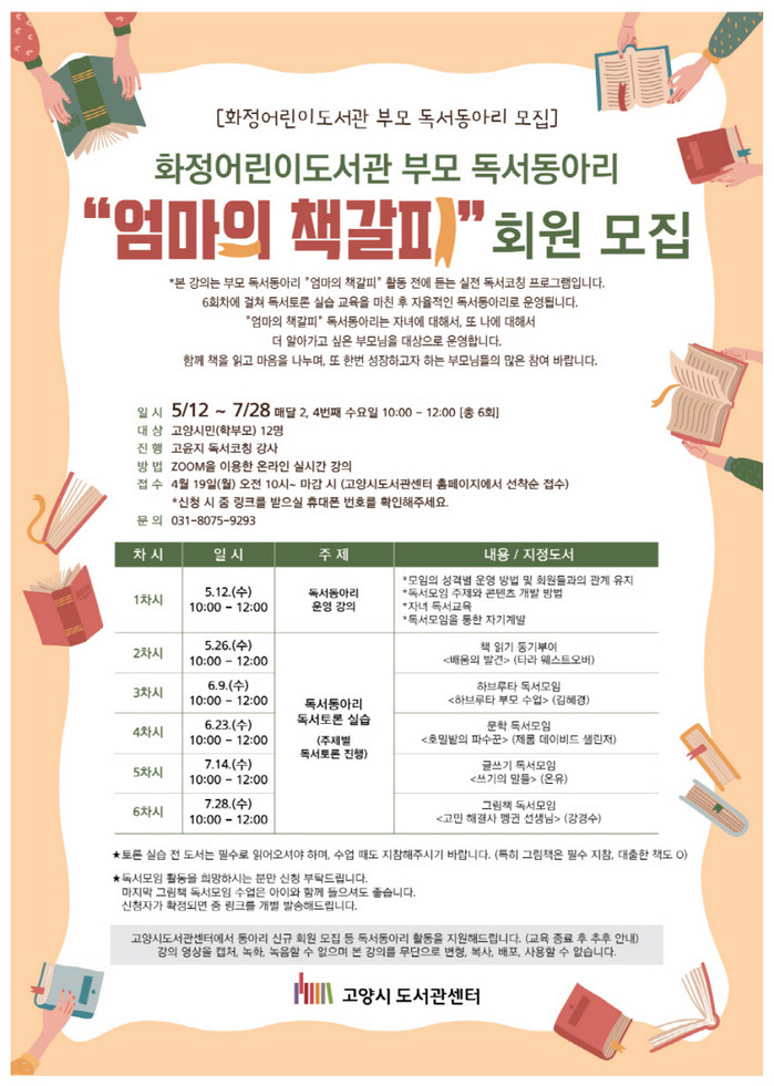 이번 강의는 오는 19일 오전 10시부터 고양시도서관센터 홈페이지에서 선착순으로 모집하며 기타 문의 사항은 화정어린이도서관으로 하면 된다.