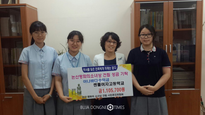 앞서 지난 7월 4일, 양촌초등학교 학생회에서 벼룩시장 수익금 10만 3,000원을, 7월 15일 광석중학교 학생회에서 프리마켓 수익금 27만 9,500원을 소녀상 건립기금으로 기탁한 데 이어 지난 8일 논산쌘뽈여고(교장 손민숙)에서도 학생들이 아나바다(중고물품 교환 판매)와 자선경매를 진행해 총 110만 5,700원을 논산 평화의 소녀상 건립 시민추진위원회(이하 추진위)에 전달했다.