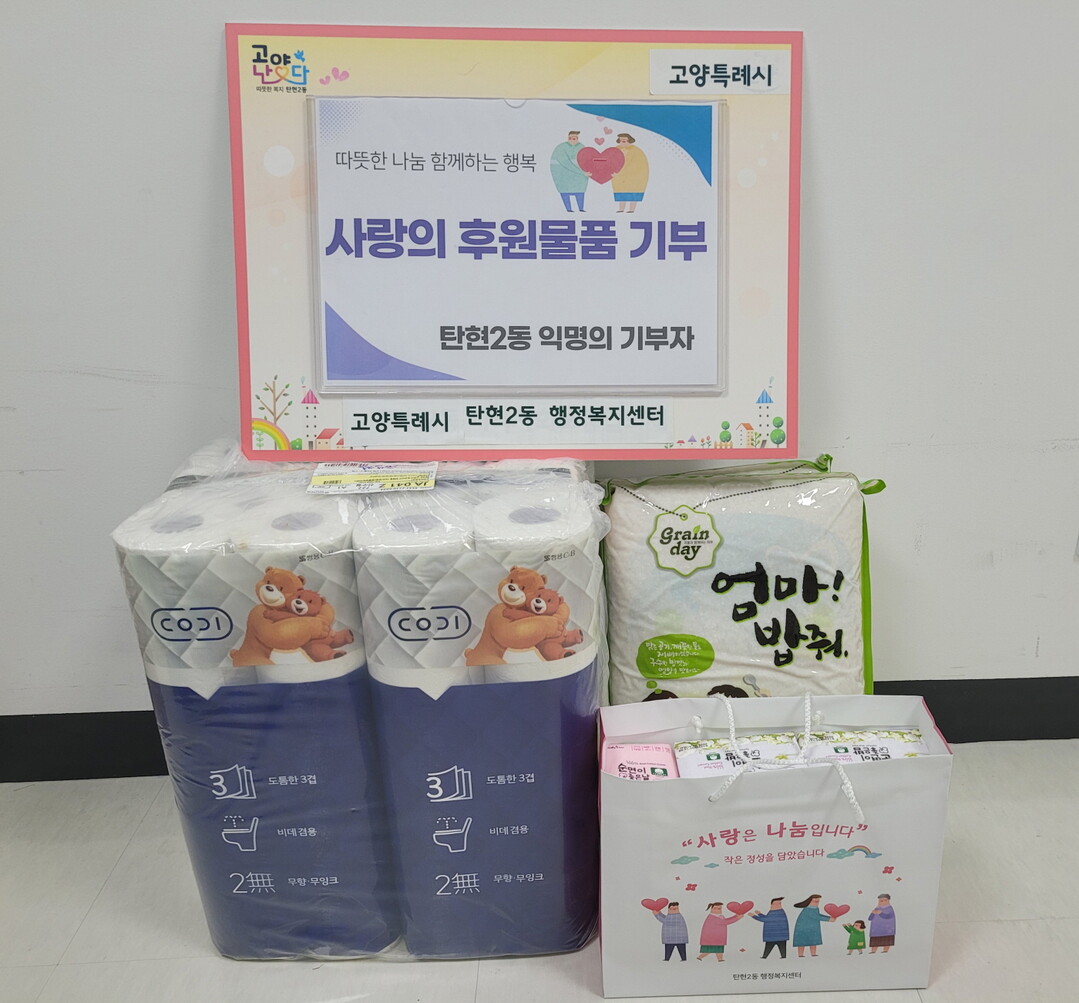 [부자동네타임즈 = 김인수 기자] 고양특례시 탄현2동 행정복지센터는 익명의 기부자로부터 후원물품(쌀, 휴지 등)을 전달 받았다고 21일 밝혔다.