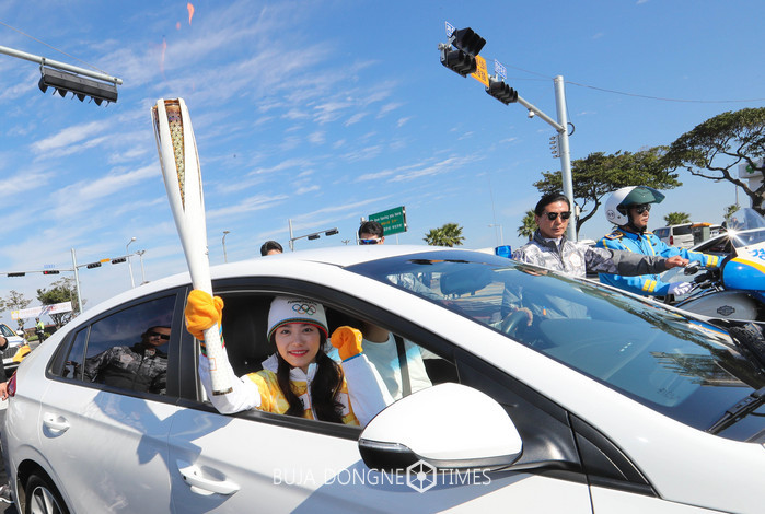 2018 평창 동계올림픽 국내 성화봉송 이틀째인 2일 전 걸그룹 아이오아이 멤버 소혜가 제주국제공항 앞 공항입구 교차로에서 현대자동차 대표 친환경 전기 자동차 아이오닉을 타고 성화를 봉송하고 있다. 2017.11.02.