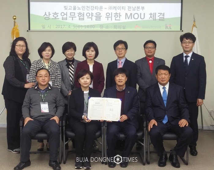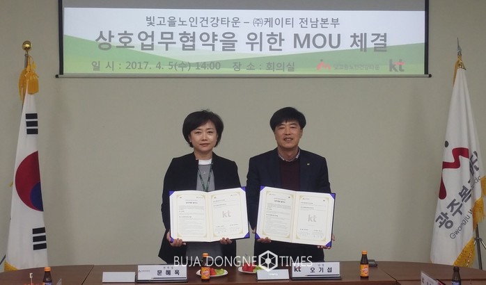 | △광주복지재단 빛고을노인건강타운은 KT전남본부 Biz법인단과 IT기기 활용 교육을 통한 세대간 정보격차 해소를 위한 업무협약을 체결했다 |