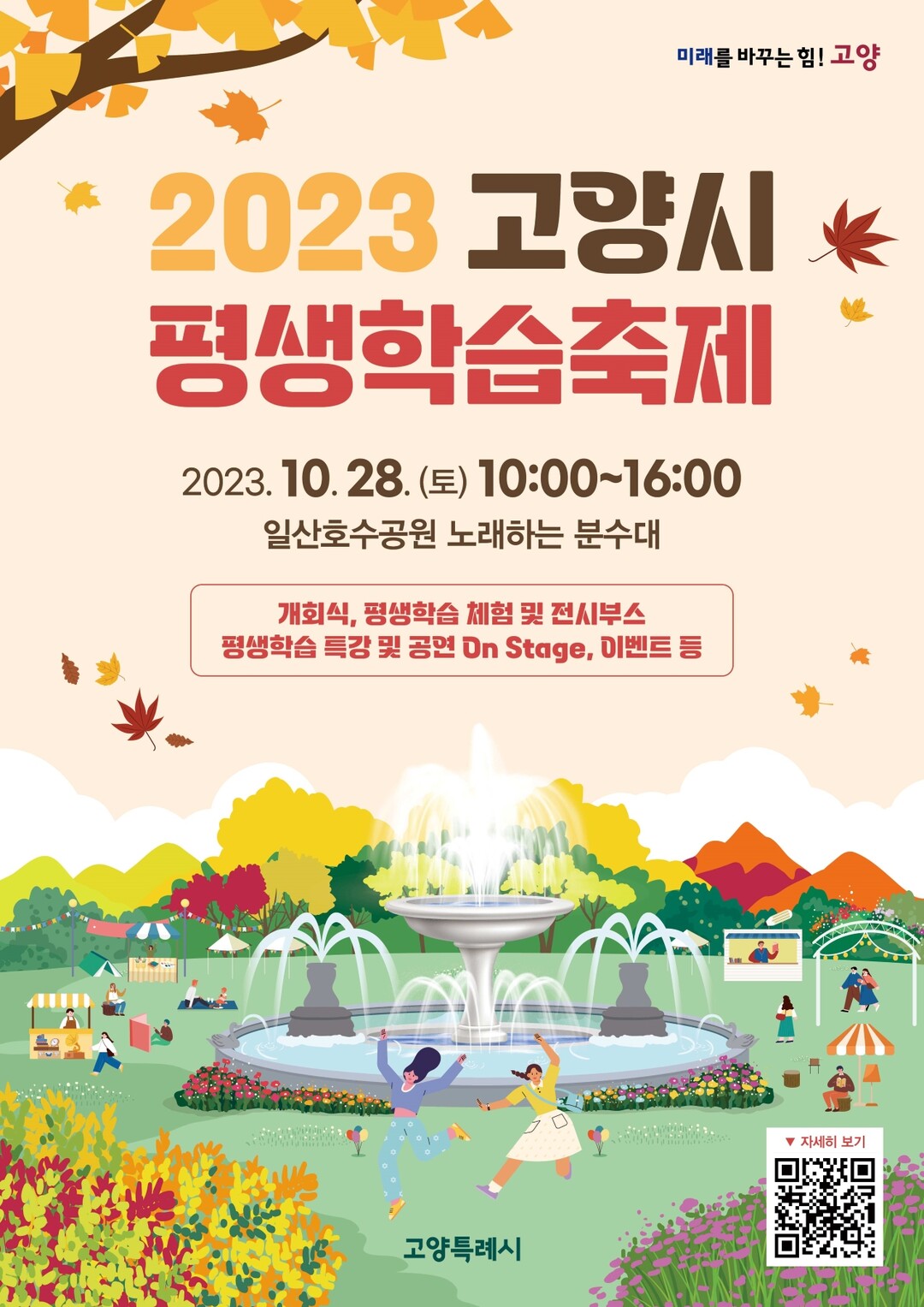 이번 축제는 2018년 이후 5년 만에 개최된다. 평생학습기관 및 단체, 성인·학생 학습 동아리 30여 팀이 한자리에 모여 2023년 고양시 평생학습 성과를 공유하고 다양한 체험 프로그램을 운영한다.