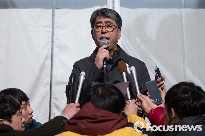 (서울=포커스뉴스) 1일 오전 종로구 조계사에서 열린 긴급회의에 이은 기자회견에서 조계종 화쟁위원회 입장 발표를 하고 있다. 정웅기 대변인은 어제 한 위원장의 퇴거를 요구하는 조계사 신도회와 한 위원장 측이 면담 도중 몸싸움이 벌어진 것에 대해 책임을 느낀다고 말하고 다시 이런 일이 생기지 않도록 한상균 위원장과 조계사 신도를 포함하는 대화의 장을 마련하겠다고 밝혔다.