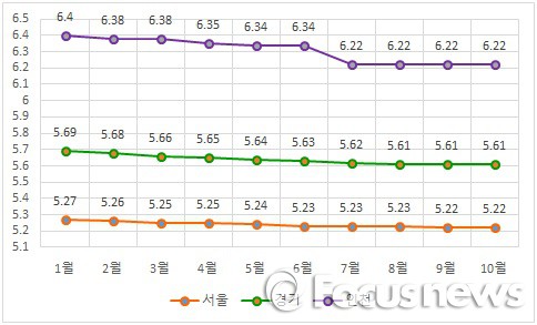 서울의 경우 올해 1월 5.27%에서 10월 5.22%로 떨어졌고 경기는 5.69%에서 5.61%로 하락했다. 인천의 경우 지난 1월 6.4%에서 지난달 6.22%로 낙폭이 좀 더 컸다.