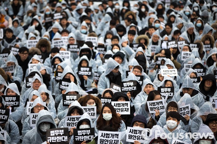 (서울=포커스뉴스) 전국 25개 로스쿨 재학생 6천여 명이 10일 오후 경기도 과천 정부청사 앞 운동장에서 ‘전국 로스쿨생, 법무부 규탄 집회’를 하고 있다.