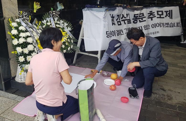 | ▲지난 9월 21일(토) 광주시 오포리에 있는 분당추모공원 휴에서 고 김수길 민청학련 회원 겸 성대출신 민주인사 5주기 추모제에서 여동생 등 참석자들이 제물을 놓고 있다. |