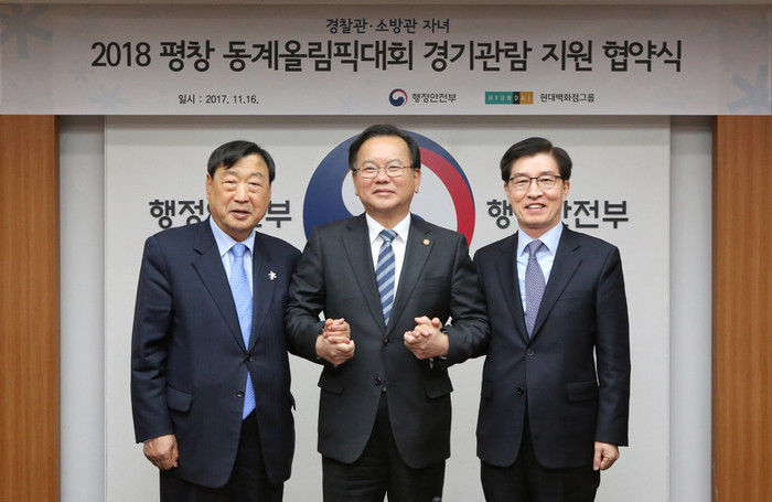 [부자동네타임즈 김현정 기자]16일 서울 세종대로 정부서울청사에서 김부겸 행정안전부 장관(사진 가운데), 이희범 평창 동계올림픽 조직위원장(사진 왼쪽), 이동호 현대백화점그룹 부회장(사진 오른쪽)이 '순직 경찰관·소방관 자녀 평창 동계올림픽 관람 지원 업무 협약'을 체결한 뒤 기념촬영을 하고 있다.