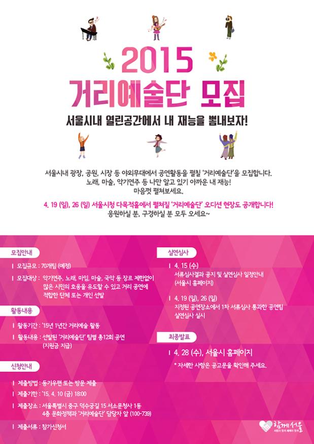 시는 노래, 악기연주, 마술, 마임, 국악 등 거리예술 공연을 선보일 ‘거리예술단’도 공개오디션으로 선발, 서울 곳곳의 거리예술존에서 12차례 공연을 선보이도록 하고 시가 실비차원의 경비를 지원한다.