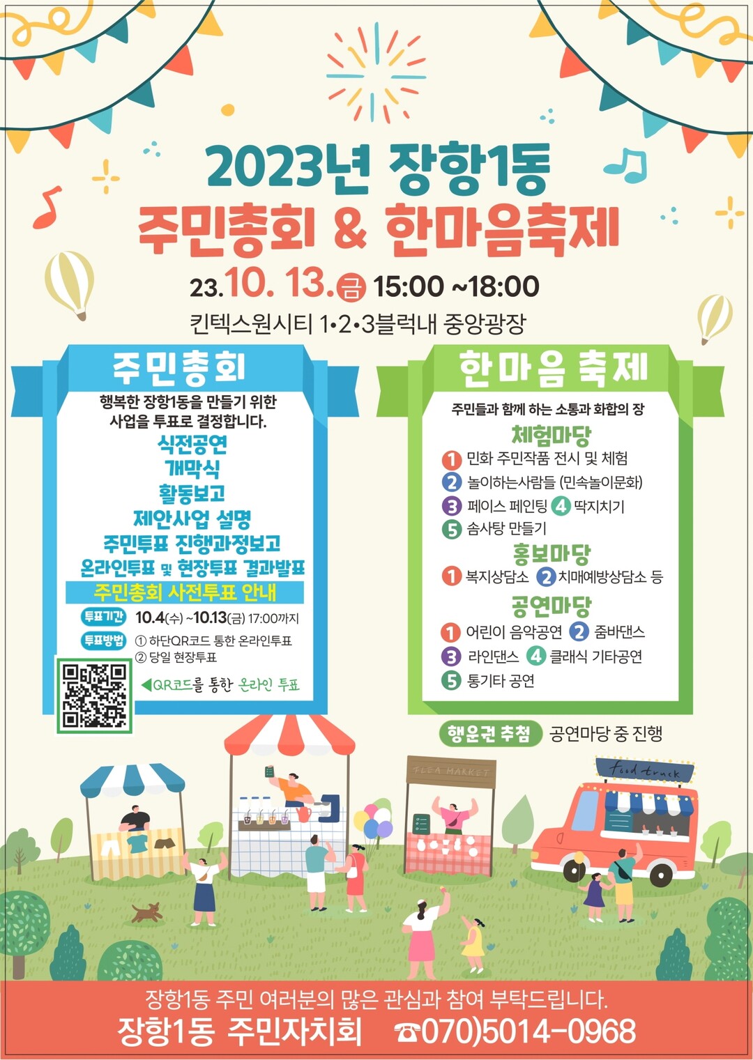 축제와 함께 개최될 주민총회에서는 2023년 주민자치회 활동보고, 2024년 자치계획 수립을 위한 마을의제 소개 및 현장 투표가 실시될 예정이다. 온라인 투표는 마을 곳곳에 배포된 홍보 전단지의 QR코드 스캔을 통해 10월 13일까지 투표 가능하다.