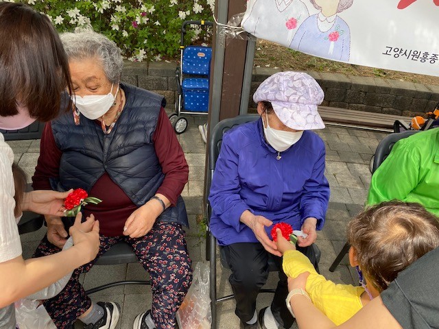 어르신을 위한 ‘사랑해孝! 함께해孝!’ 행사는 도래울마을 1단지 LH주거행복지원센터 및 고양원흥종합사회복지관과 함께 진행됐다. 1단지 LH주거행복지원센터에서 준비한 카네이션과 떡을 어르신들께 나눠드리고 건강상태를 확인하는 등 안부를 묻고 함께 사진도 찍으며 이웃 간 정을 나눴다.