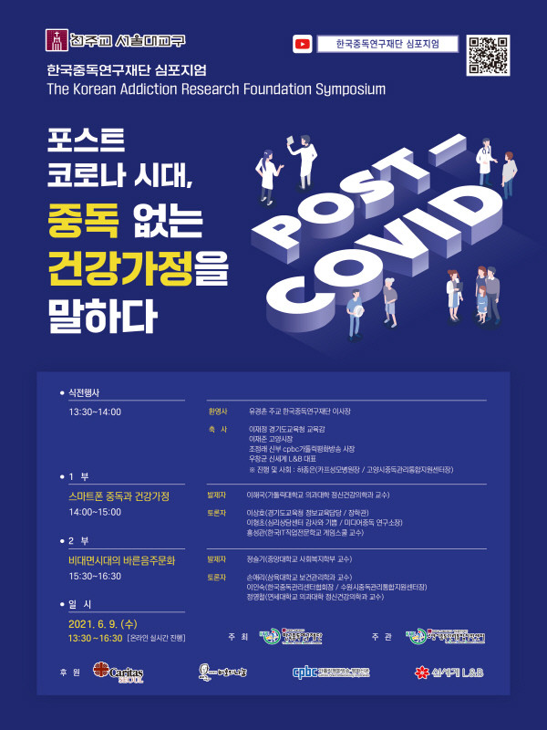 심포지엄은 오는 9일 오후 1시 30분부터 4시 30분까지 유튜브 라이브 ‘한국중독연구재단 심포지엄’를 통해 진행된다. 중독 문제로 힘들어하는 당사자 및 가족 등 누구나 온라인으로 참여할 수 있다.