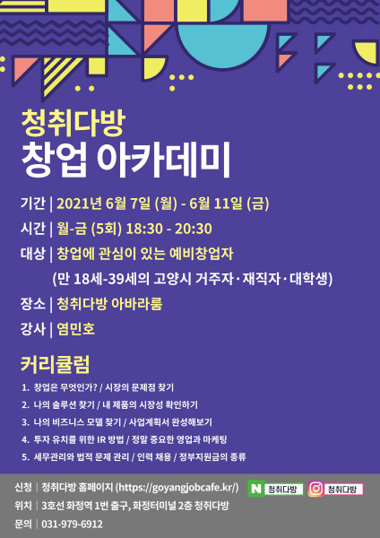 교육 대상자는 만 18세부터 39세 이하의 고양시 거주자·재직자·대학생 중 창업에 관심 있는 사람이다.