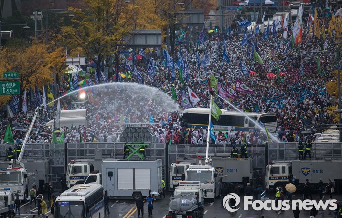 | △ 지난 14일 오후 서울광장에서 열린 민중총궐기대회에서 경찰이 시위대를 향해 물대포를 쏘고 있다. <사진제공=포커스뉴스> |