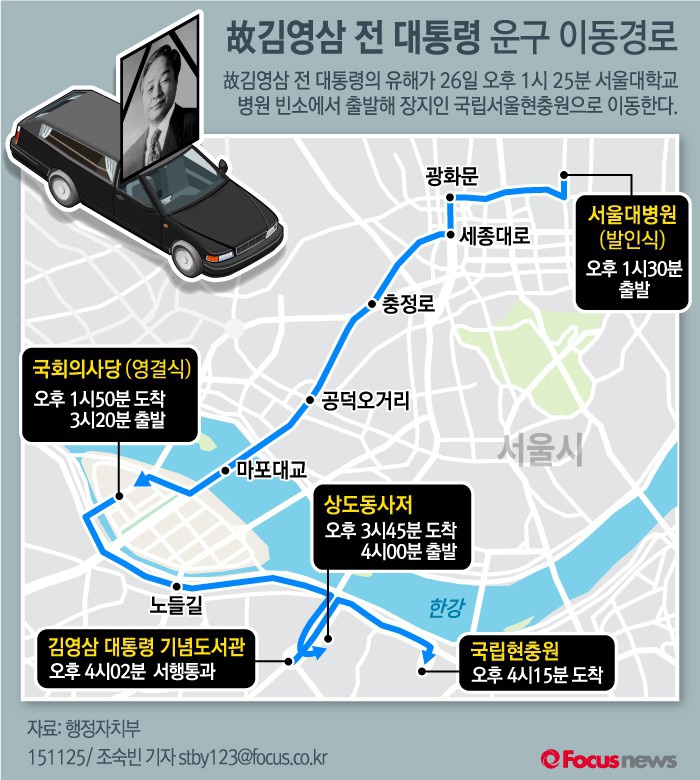 안장지로 이동하는 구간에 서울 동작구 상도동 김 전 대통령의 사저와 기념도서관을 경유할 예정이다.