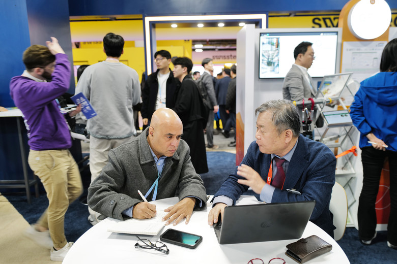| ▲1월 10일(현지시각) 미국 라스베이거스에서 개최된 CES 2024에서 한국수자원공사관에 참여한 협력 기업 ‘스페이스맵’이 비즈니스 미팅을 진행하고 있다. |