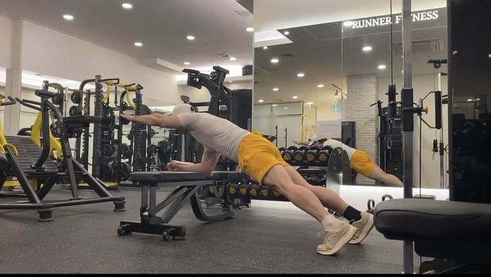 기본 플랭크를 진행 후 한손은 머리 위로 쭈욱 뻗어준다. 반대쪽도 이어서 실시.