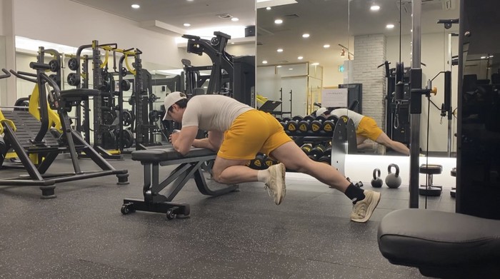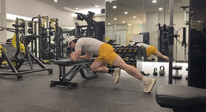 기본 플랭크와 동일한 자세를 유지하고 한쪽 다리를 뻗어 무릎읖 피고 뒤로 차준다. 반대쪽 동일하게 실시.