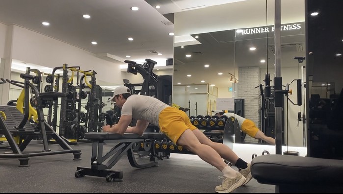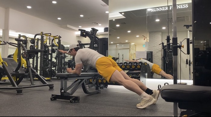 팔꿈치를 의자 위에 올린뒤 머리부터 발끝까지 일직선을 유지한다.