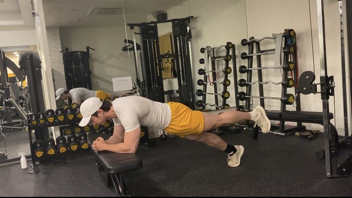 기본 플랭크와 동일하게 진행 후 무릎을 차준다. 반대쪽 다리도 이어서 실시.